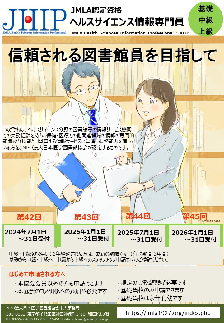 この資格は,ヘルスサイエンス分野の図書館等の情報サービス機関での実務経験を持ち,保健・医療その他関連領域の情報の専門的知識及び技能と,関連する情報サービスの管理,調整能力を有している方を,NPO法人日本医学図書館協会が認定するものです。「ヘルスサイエンス情報専門員」資格取得を目指すことにより,協会会員が,さらにそれぞれの能力の向上を図ること,また,これらの能力を持つ医学図書館員の育成を促すことを本制度の目的としています。保健・医療情報の専門家としての経歴を積み,社会的に認められる資格を望む方,情報サービス機関の諸活動に積極的に貢献していく意志のある方は是非ご申請ください。